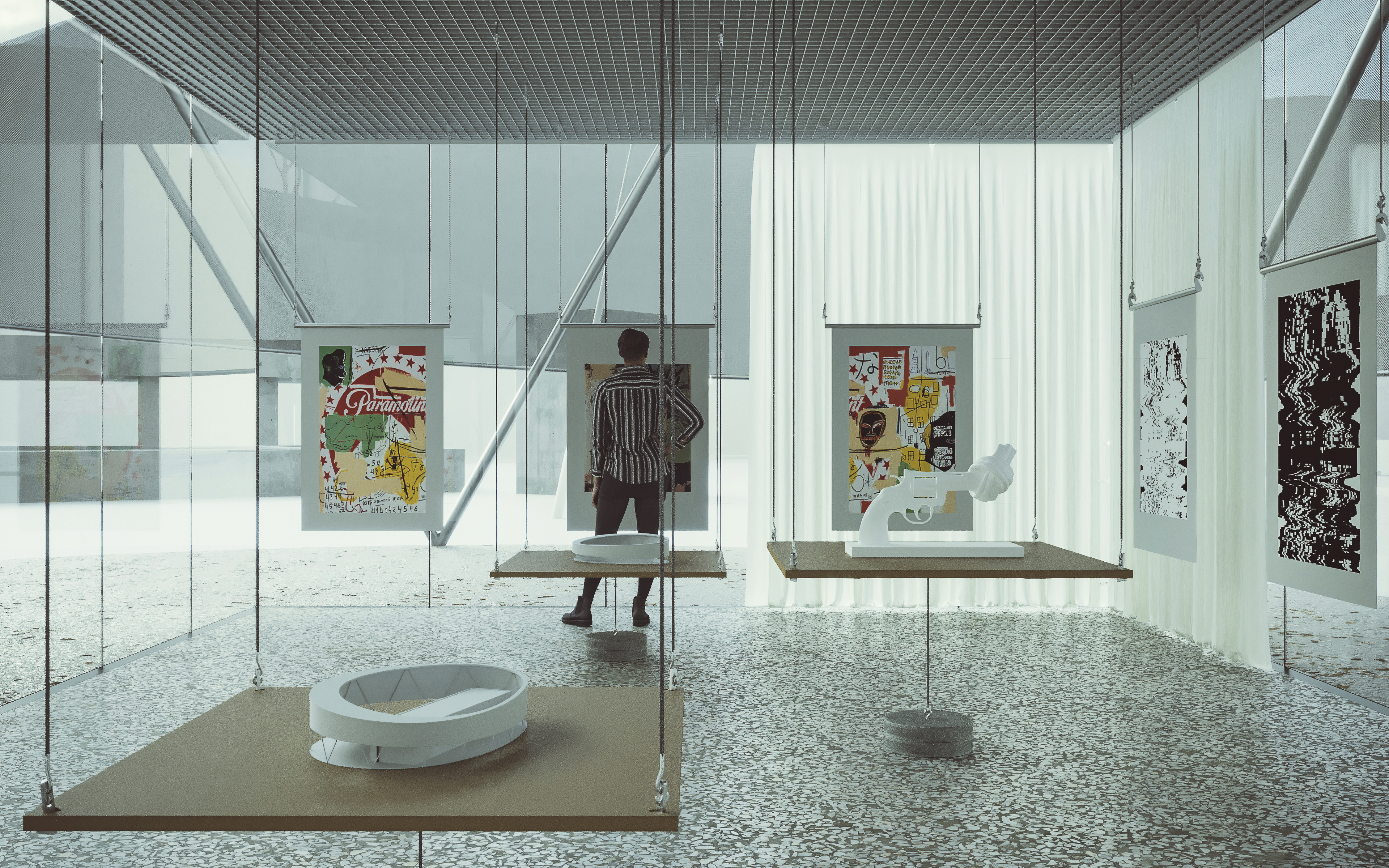 Materials used on the outside of the building were used inside as well, such as terrazzo flooring, mash steel ramps as ceiling grids, lastly stainless steel & MDF counters.