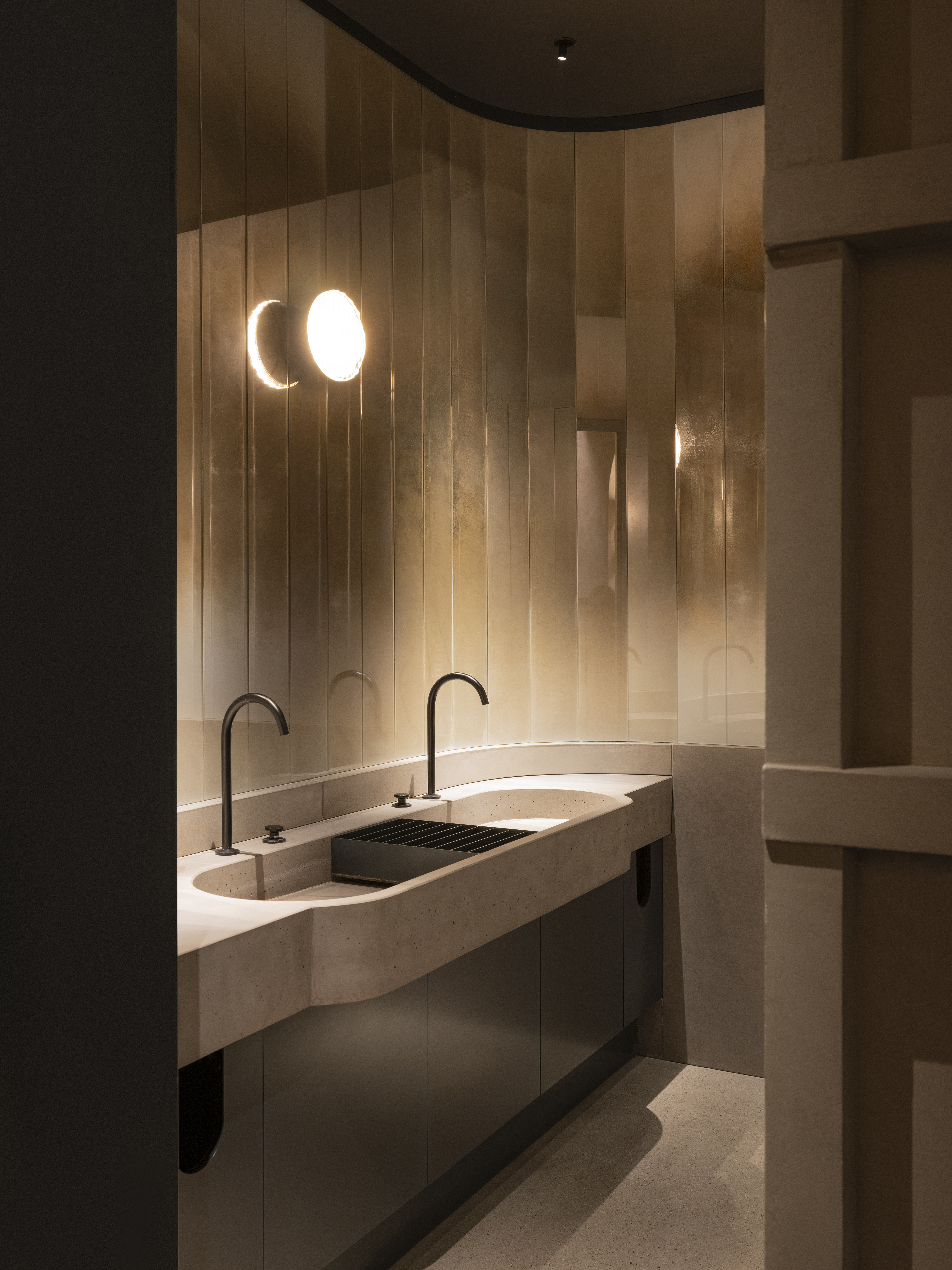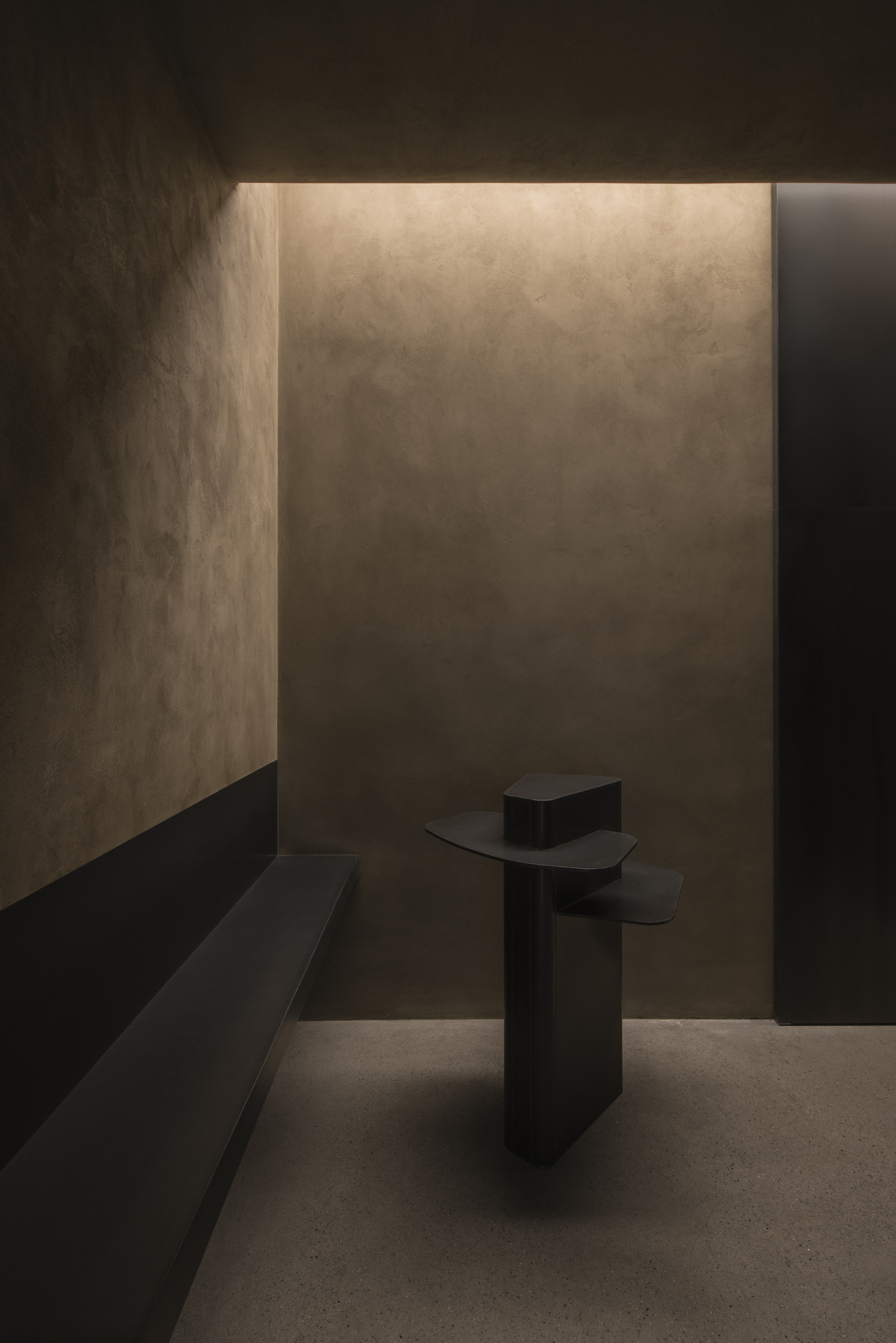 Upon entering a heavy wooden door fitted diagonally in a former column, guests find themselves in a vacuum-like space with textured plaster walls that contrast seamlessly with sleek black accents. Lighting is an integral feature, with hidden sources washing the curved surfaces in a diffused, golden glow, enhancing the tactile depth of the space. The palette of stone, metal and charred wood balances raw and refined elements. The washroom features a concrete countertop and distressed mirror installation by Boldizar Senteski.